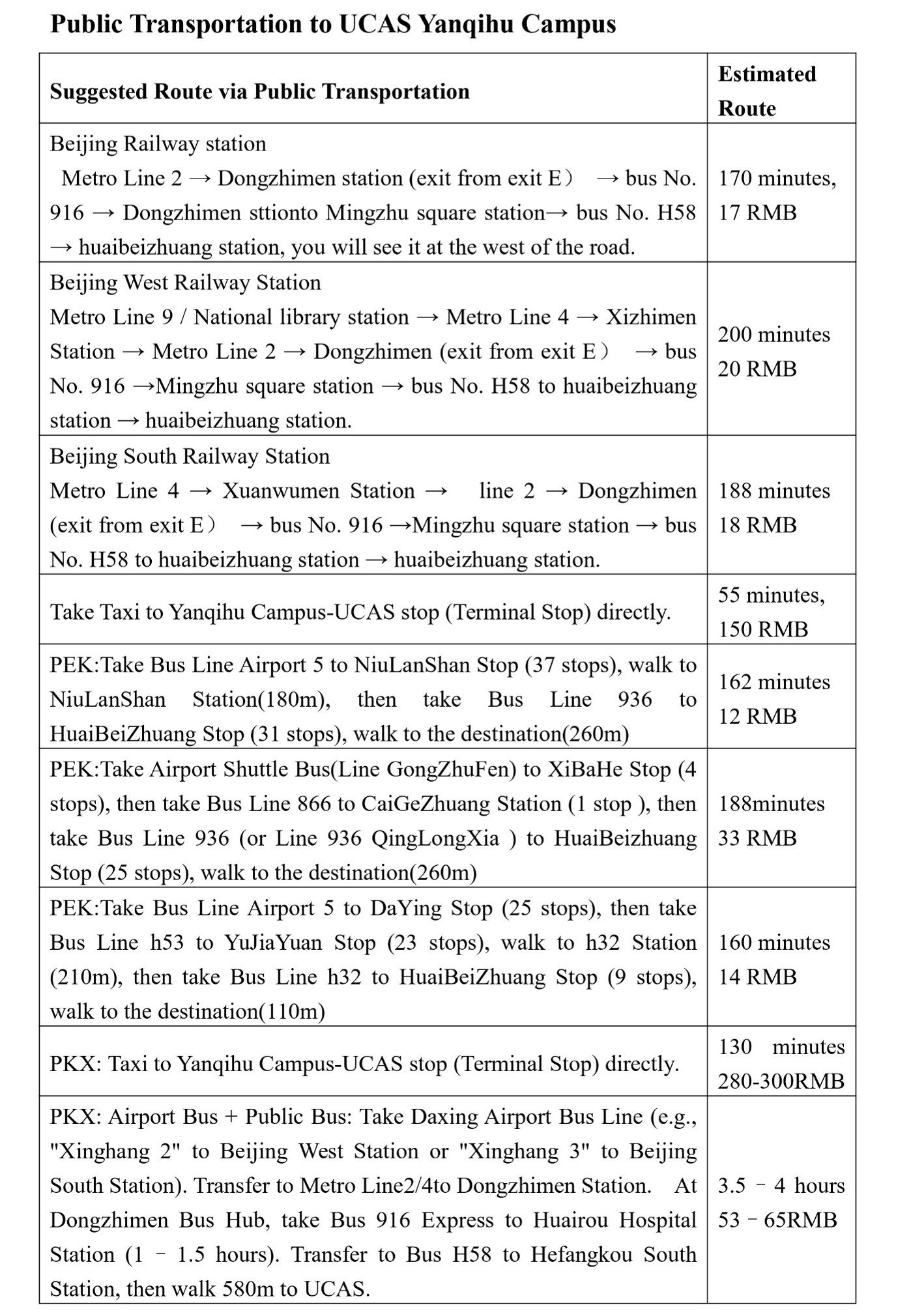 The suggested route via public transportation from Beijing South/Beijing West/ Beijing railway station to UCAS, Yanqihu Campus is as follows: