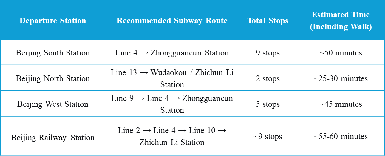 The suggested routes via public transportation from Beijing South/Beijing West/ Beijing railway stations to the conference venue are as follows: